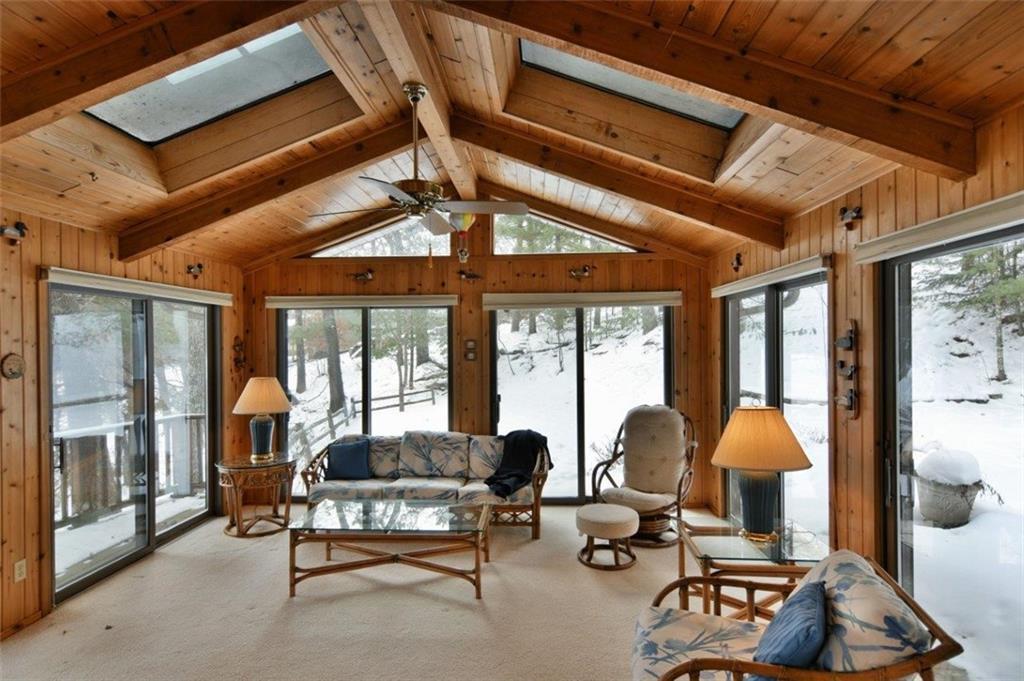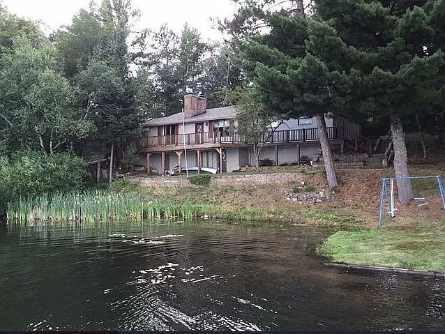 If you are curious about the floating home feeling, this main level lake home has that feeling! We know living on the water reduces stress while increases your sense of being! 4.9 acres, over 300 ft of lakeshore encompasses around a Unique Lake home. Vaulted Cedar Ceilings, double fireplace, Sun room w/ skylights, 2 bd and a bath on main floor with attached garage. Stroll downstairs from the garage or from inside the lake home living area to a recreational room with fireplace, 2 more bedrooms (one with no closet), bathroom and laundry /workshop room. Storage shed just outside the garage area for water toys, paddle boards & fishing poles. Second garage to store your boats and toys or expand on the total 5 acres (2 lots). 2002 Septic, furnace inspected & cleaned, furnished to move right in.